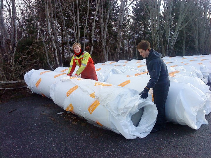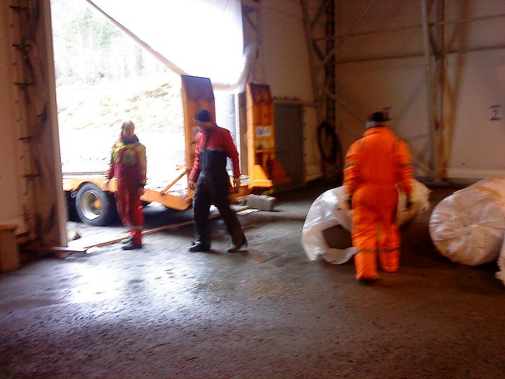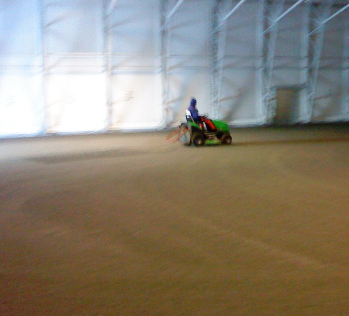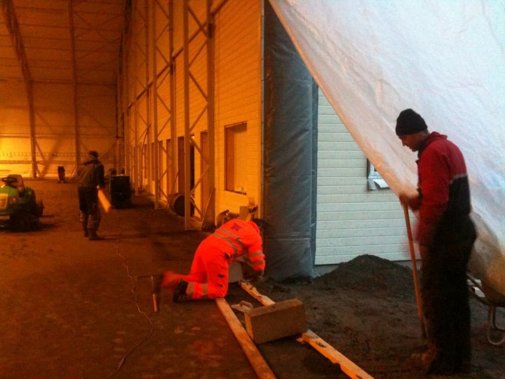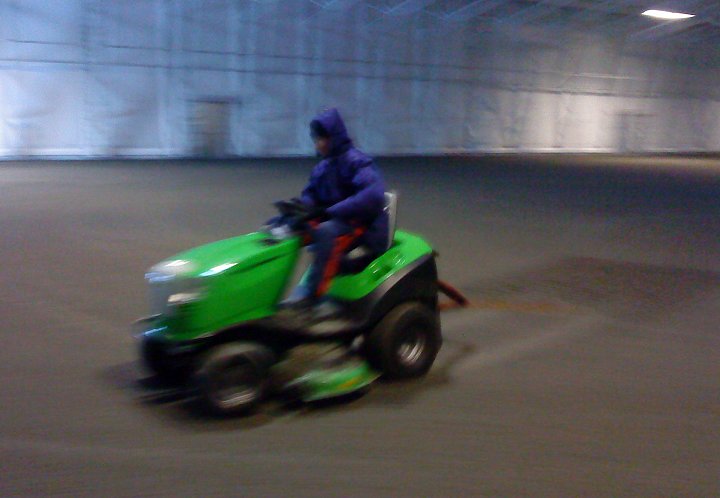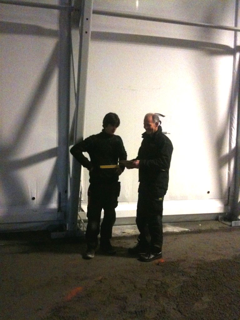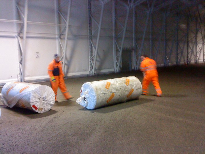 No i kveld var karane som skal legge graset på inspeksjon, og det meste skal vere klart for legging. Gummipadden som skal ligge nederst er på plass inne i hallen. Utanfor ligg kunstgraset klart til å bli rulla ut opp på padden.